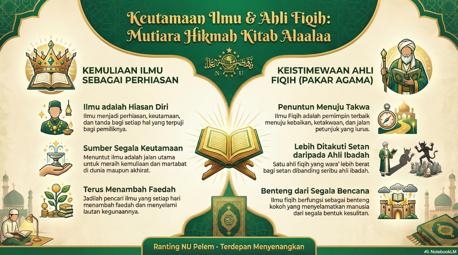 PELEM, rantingnupelem.or.id – Dalam tradisi pesantren, Kitab Alaalaa merupakan salah satu kitab dasar yang sangat populer untuk membentuk karakter dan memberikan fondasi bagi para santri dalam menimba ilmu. Kitab ini menegaskan bahwa keberhasilan dalam meraih ilmu tidak datang secara instan, melainkan harus memenuhi enam syarat mutlak.